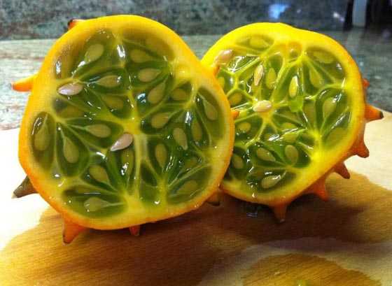 كيوانو: فاكهة من فصيلة البطيخ، كانت تزرع في الأساس في أفريقيا، وهي صفراء من الخارج، ومليئة بالنتوءات، ومن الدَّاخل تتميَّز بلون أخضر وبذور متراصة كما في الخيار، وبالنِّسبة للطَّعم فبالإمكان تشبيه الطَّعم بدرجة مُخففة من الموز غير النَّاضج.