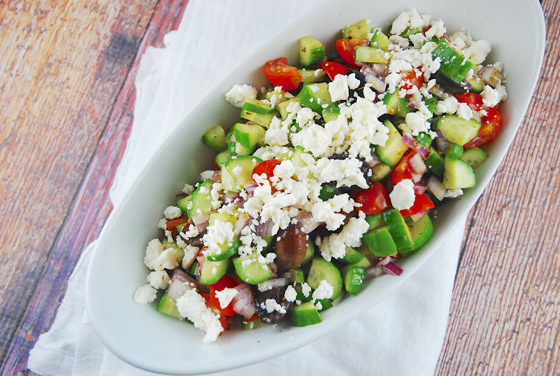 هي سلطة لذيذة وصحية، قريبة جدا من السلطة العربية المعروفة لكن مع إضافة الجبنة البيضاء والزيتون.