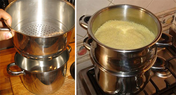 3. نرفع الطنجرة من فوق النار، ونضع الكسكس في الوعاء السابق ونرش عليه من جديد كوبين من الماء البارد، مع رشة ملح، وملعقة كبيرة زيت زيتون، ونخلطه باليد ونتركه 5 دقائق ثم نرجعه الى الكسكاس ونتركه يتبخر مدة ربع ساعة إضافية. البعض يكرر هذه العملية مرة إضافية حسب الحاجة.