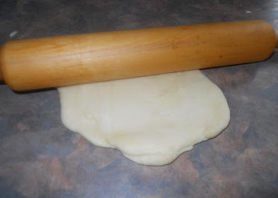 2. يقطع العجين لكرات صغيرة ثم يفرد (يبسط او يرق) العجين لتكون لدينا عجينة رقيقة باستخدام المدلك (الشوبك او المدلاك او النشابة) وهي أداة خشبية على شكل أسطوانة بمقبضين.. وطبعا يتم رش سطح الطاولة أيضا ببعض الدقيق ليسهل فرد العجين.