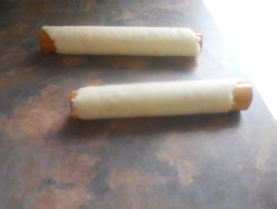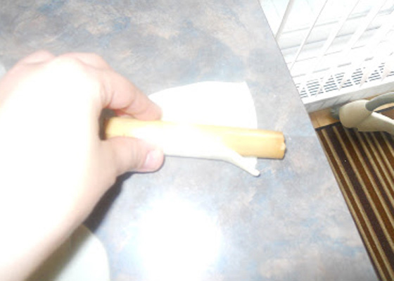 4. نقوم بقياس قطعة العجين اللازمة للفها حول السيجار. يتم لف قطعة العجين الرقيقة بشكل مرتب على القصبة الصغيرة.