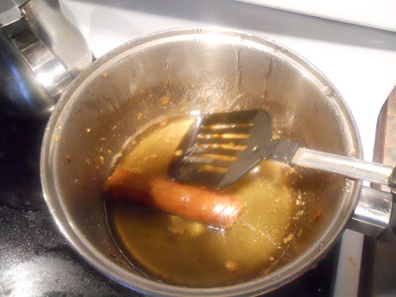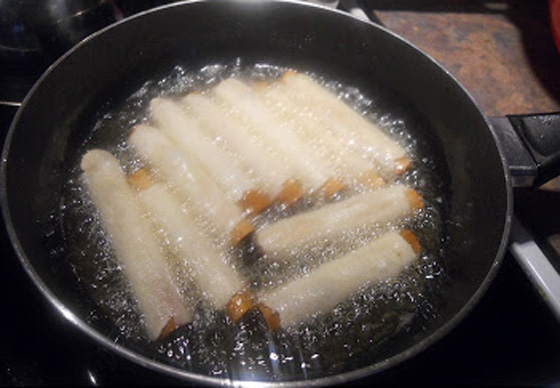 6. يقلى في الزيت الحار والافضل استعمال زيت عميق حتى لا نحتاج لتقليب. ننتظر قليلا حتى يصبح ذهبي اللون وينضج العجين.