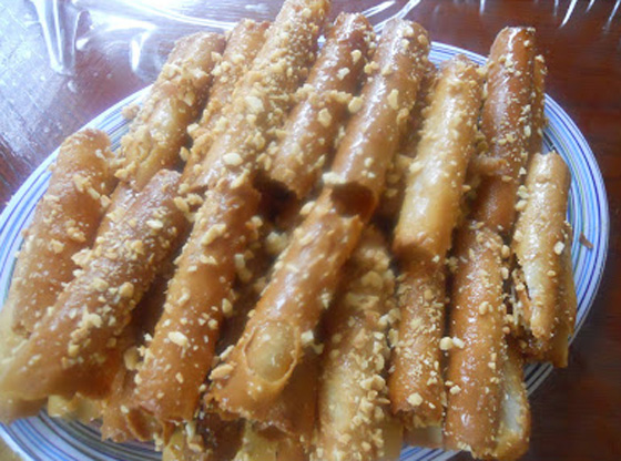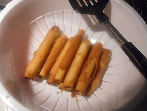 7. ننشل القصبات من الزيت ونضعها في مصفاة وقتا قصيرا للتخلص من الزيت الزائد.ثم نسحب القصبات من داخل العجين برفق حتى لا يتكسر العجين.