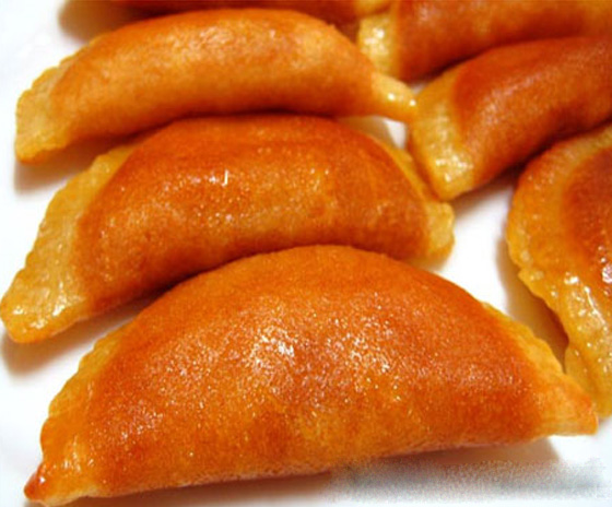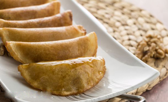 4. تكمل سكب بقية العجينة فى المقلاة بنفس الطريقة. تترك القطايف تبرد تماماً قبل أن نبدأ فى حشوها، ولا ننسى أن القطايف يجب أن يتم حشوها وهي طازجة أو في نفس اليوم الذى صنعت فيه، لأن عند تخزينها لن تستطيعي إغلاقها على الحشوة. بعد حشو القطايف يمكنكِ قليها فى الزيت الخفيف والتمتع بطعمها الرائع بعد وضعها فى مزيج العسل او القطر.