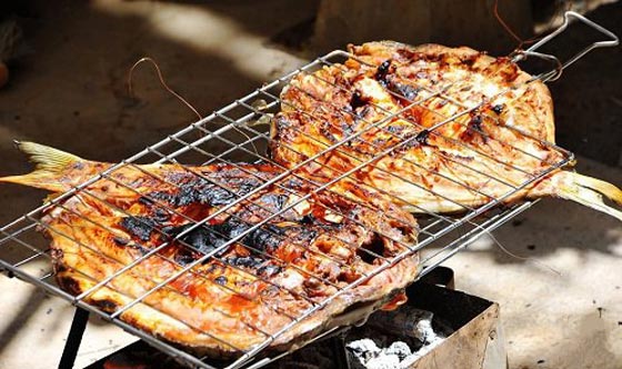 - أخيرا توضع شبكة الشوي على فوق الفحم مباشرة بحيث يتم تعريض قشرة السمكة (الجاد) للنار بضعة دقائق وتقدم ساخنة ويمكن لمن يحب إضافة البهارات اليها.