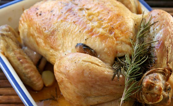 6. في وعاء اخلطي الخل والمرق وباقي كمية الزيت وإكليل الجبل وصبي الخليط على صينية الدجاج وأعيدها للفرن لمدة 25 دقيقة حتى تصبح الدجاجة ذهبية و ناضجة.