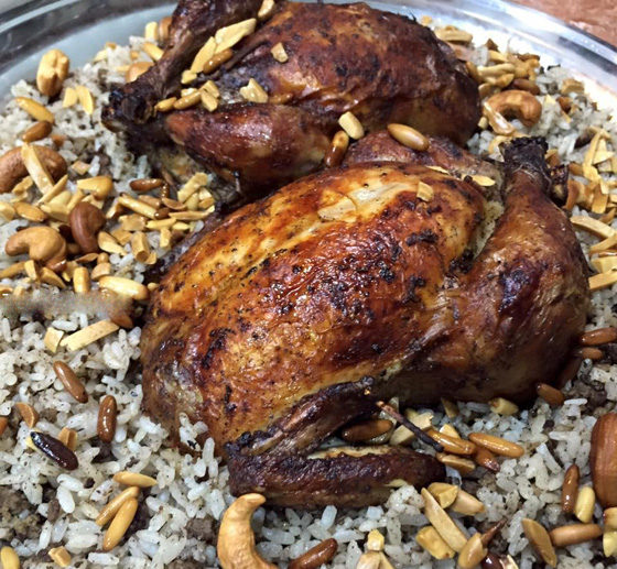 1. تغسل الفراريج وتتبل بالبهارات القرفة والبهار السادة والفلفل الأسود والملح ثم تسلق.
