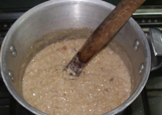 6. نضيف المرق المرفوع سابقا بالتدريج الى الهريسة حتي تكتمل. نستعمل فقط كمية المرق اللازمة وليس كلها.