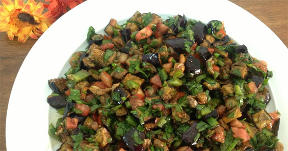 - يحمر الباذنجان في الزيت ثم ينقل الى وعاء التقديم ونضيف اليه البقدونس المفروم والطماطم المقطعة قطعًا صغيرة ثم يضاف إليهم الزيتون.