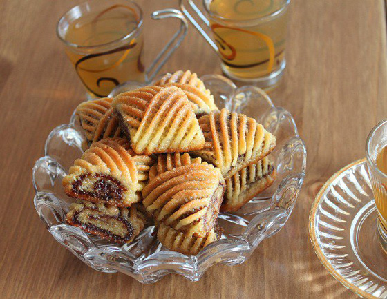 نخلط عصير الليمون مع الملح، الفلفل والشطة ونسكب الصلصة فوق السلطة ونخلطها بلطف حتى لا يتفتت الباذنجان.كعك المقروض (او المقروطة) بالتمر: