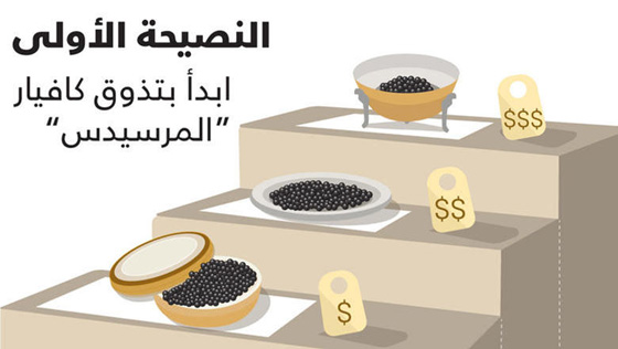 1. النصيحة الأولى: ينصح خبير الكافيار ألكسندر بتروسيان المشترين الجدد بتذوق أنواعاً مختلفة من الكافيار، وعدم التوجه مباشرة إلى الكافيار الباهظ الثمن. مثلا، بعد تذوق "المرسيدس في عالم الكافيار،" انتقل إلى كافيار "الرولز رويس والمايباخ".