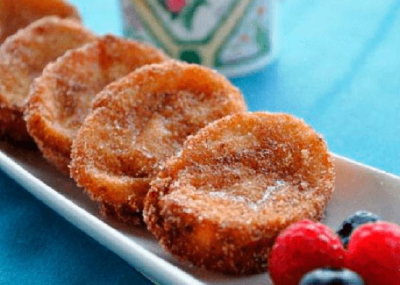 - ضع شرائح التوست المقلي في طيق به ورق مطبخ (مناشف ورقية) لامتصاص الزيت الزائد. في وعاء آخر نخلط السكر المتبقي (1/2 كوب) مع القرفة.