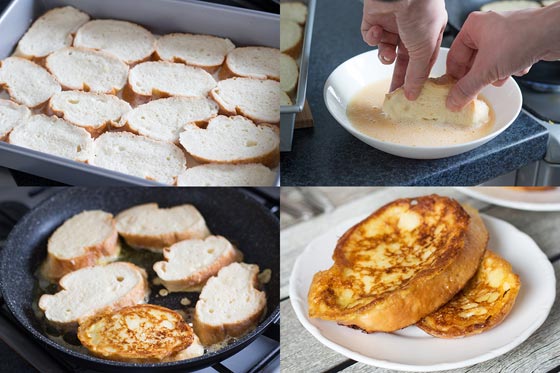 - اخفق البيض في وعاء واغمس شرائح الخبز في خليط البيض. في هذه الأثناء، قم بتسخين بعض من زيت الزيتون في مقلاة عميقة سميكة القاع، على حرارة متوسطة.