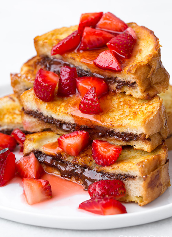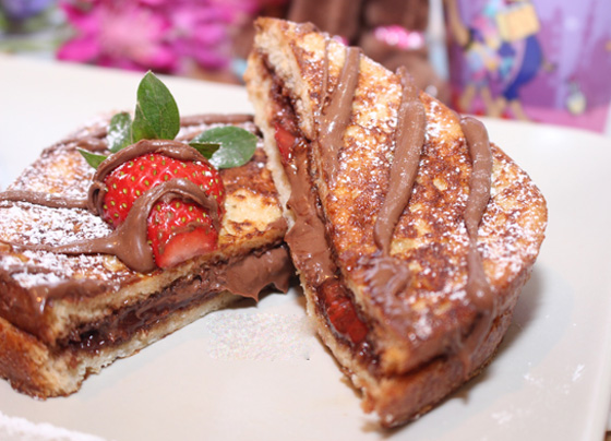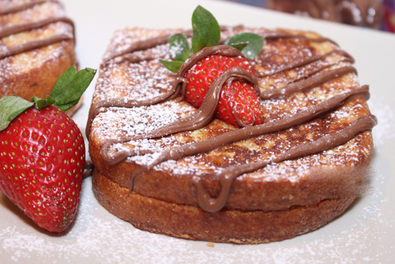 5. وزعي النوتيلا على الخبز وزينيه بالموز والفراولة والسيرب وقدميه ساخنا.