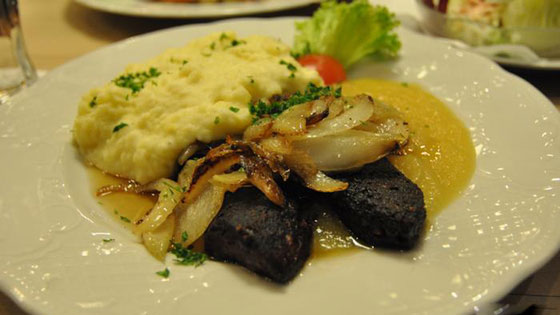 5. "هيمل أوند إيد" (الأرض والسماء): عند التفكير في السماء، من غير الممكن أن يتبادر إلى الذهن نقانق الدم، إلا أنها جزء هام من الطبق الألماني المسمى (هيمل أوند إيد) الأرض والسماء، الذي يحتوي أيضاً على البصل المقلي والبطاطس المهروسة وصلصة التفاح. على الرغم من أن نقانق الدم هو المكون الرئيسي، غير أن الاسم مستمد من التفاح، التي ذكر وجودها في السماوات والبطاطس (المسمى في الألمانية أيضاً تفاح الأرض) من الأرض.