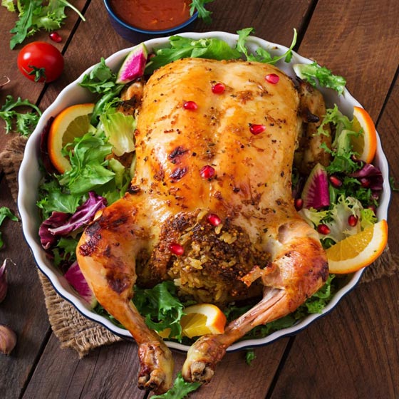 4. اسكبي ما تبقى من الأرز بطبق التقديم، وزيني بالصنوبر، واللوز، وقدمي الدجاج المحشي ساخناً مع السلطات العربية، أو سلطة خيار باللبن.