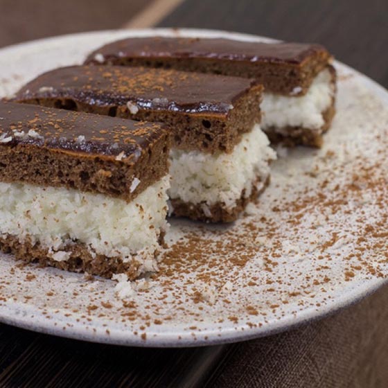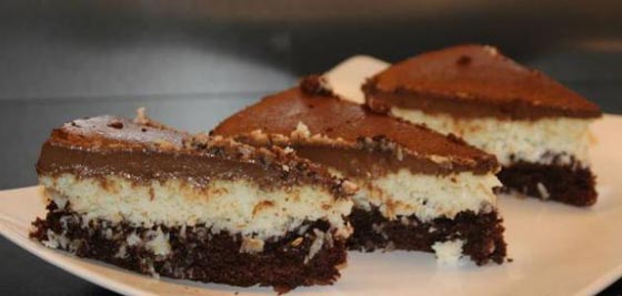 4. لعمل تغليفة الشوكولاتة: اخلطي في وعاء على حمام مائي الكاكاو البودرة والسيرب وزيت جوز الهند حتى تتجانس المكونات ويصبح المزيج ناعما ثم صبي المزيج فوق طبقة حشو جوز الهند واتركيها في الثلاجة لمدة ساعتين أيضاً.