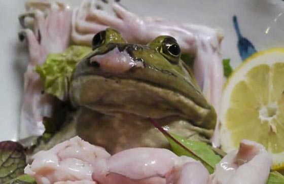 ساشيمي الضفدع-بلدان شرق آسيا: يمكن للغداء في العديد من البلدان الشرق آسيوية، تحديدًا في اليابان، الصين وفيتنام، أن يكون ضفدعًا حيًا، يطعن بسكين حاد، ويسلخ جلده ثم يقطع كله ما عدا الرأس، ويقدم فوق طبقة من الثلج مع شرائح الليمون والخس، وقلبه ما زال ينبض. لا يستطيع كثير من الناس الاستمتاع بتجربة تناول طبق يحتوي عينين ما تزالان تحدقان به، إلا أن عدد من يستطيعون على ما يبدو، كاف لاستمرار بيع هذا الطبق.