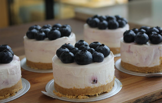 6. وزعي حشوة البلوبيري على الوجه وضعي الصينية في الثلاجة لمدة ساعتين قبل التقديم وقدميها باردة.