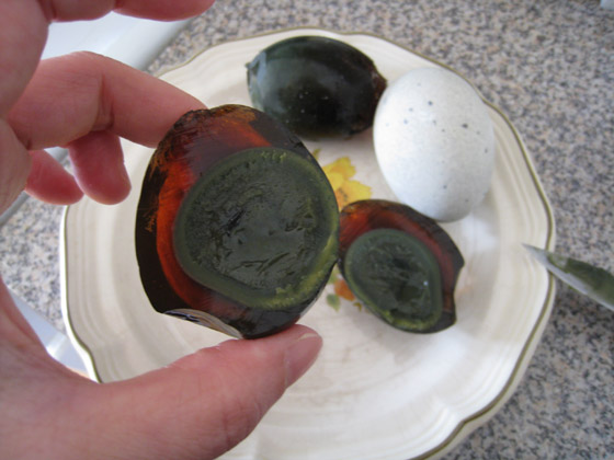 الاختلاف في هذه الوصفه شائع في شمال الصين وهي شرائح من بيض القرن توضع فوق التوفو بالإضافة إلى كميات من الزنجبيل والبصل الأخضر المقطع إلى شرائح صغيره كطبقه من الزينة ثم يرش الطبق بصلصة الصويا الخفيفة وزيت السمسم للطعم. يطبخ أيضاً مع عصيدة الأرز ولحم الخنزير العجاف ويتم تقديم هذا أحياناً في المطاعم الصينية التقليدية. وعلى الرغم من أن هذا الطبق مشهور جداً في بلدان شرق آسيا كالصين وتايوان واليابان الا أن كثر من خارج تلك المنطقة تذوقوه ولم يتحملوا مذاقه على الإطلاق، لا بل أكدوا أنه مقرف جداً، ولذلك يتم إستخدامه في الكثير من البرامج التلفزيونية الترفيهية الغربية كنوع من العقاب للمشتركين.