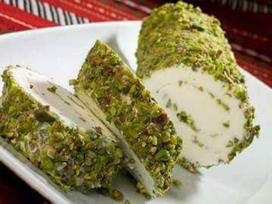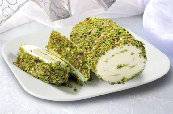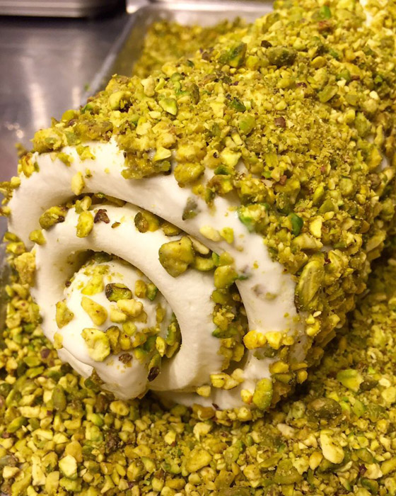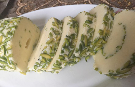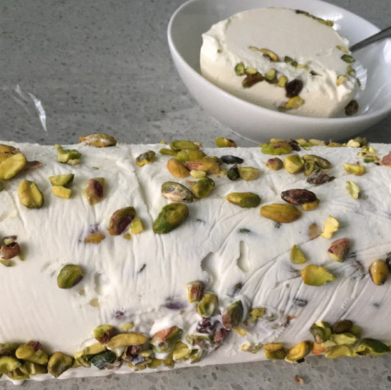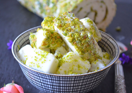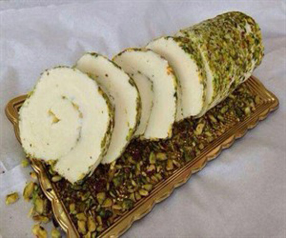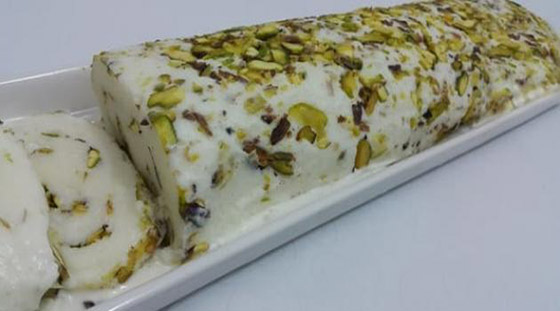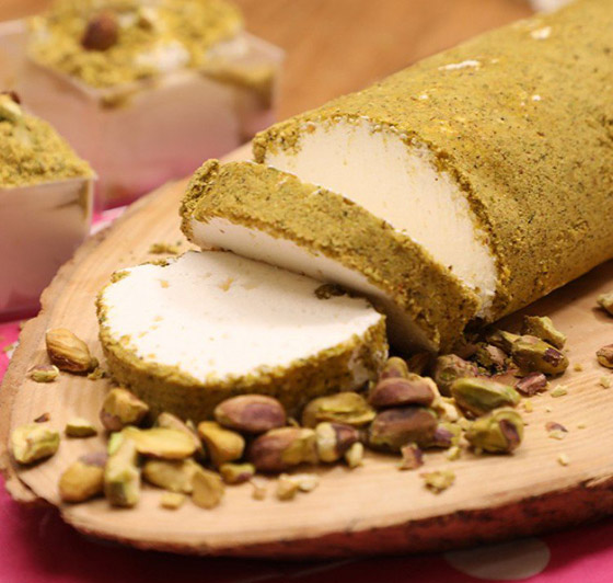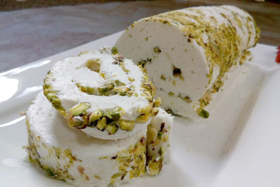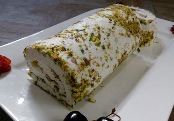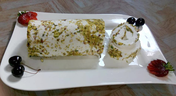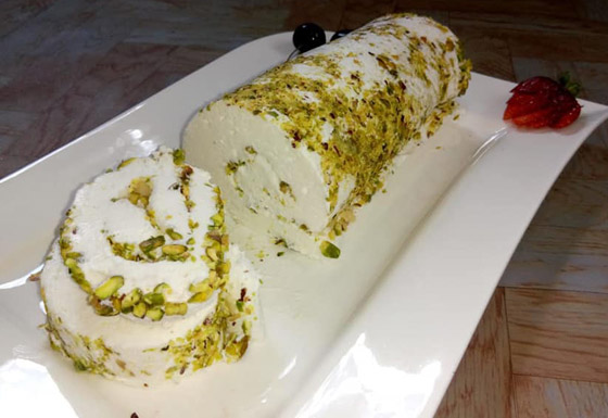 4. ضعي كمية خليط الكريمة المخفوق بطرف ورقة الزبدة، وفوق الفستق الحلبي، ولفي ورق الزبدة على شكل رول (أسطواني).