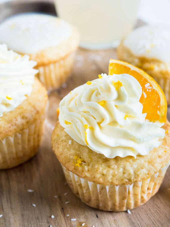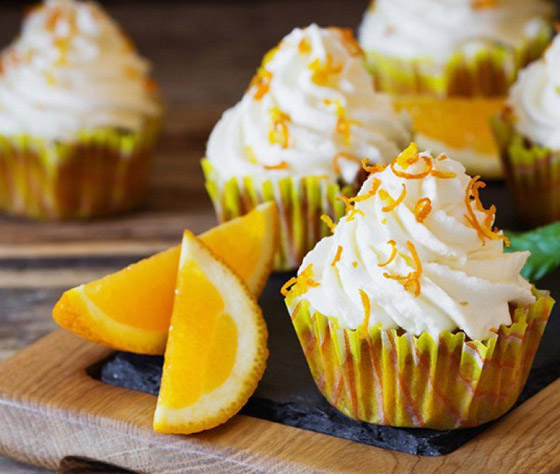 8. وزعي خليط الكيك في صينية الكب كيك وأدخليها للفرن المحمى مسبقا لمدة 20 دقيقة أو حتى ينضج ثم ادهني بواسطة فرشاة وجه الكب كيك بملعقة عصير البرتقال الباقية.