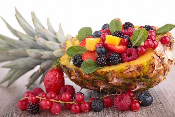 إحدى الطرق المبتكرة لتقديم طبق سَلطة الفواكه هي أن يكون الطبق بحد ذاته عبارة عن فاكهة. قم بتقطيع أناناسة طولياً إلى قسمين، وأفرِغ محتواهما، ثم املأ جوف الأناناس بخليط الفواكه المقطَّعة. من الممكن أن تستخدم البطيخ أو الشمام بالطريقة نفسها ليكونا وعاء لسلطة الفواكه الخاصة بك.