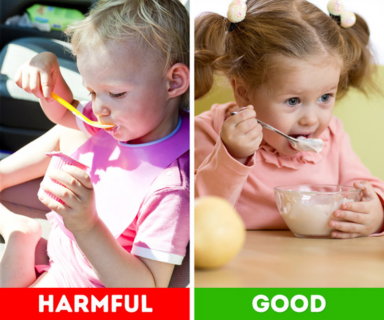 على الرغم من أن الزبادي العادي يعد إضافة رائعة وصحية في نظام غذائي للطفل، إلا أن زبادي الأطفال الجاهز هو عكس ذلك تمامًا، فالسكر والألوان الاصطناعية الموجودة في الزبادي غير صحية حقًا للأطفال وليست مفيدة على الإطلاق. بدلاً من ذلك، يمكنك شراء اللبن الزبادي العادي وتحليه باستخدام العسل، يمكنك أيضا استخدام الزبيب أو الفواكه المجمدة.