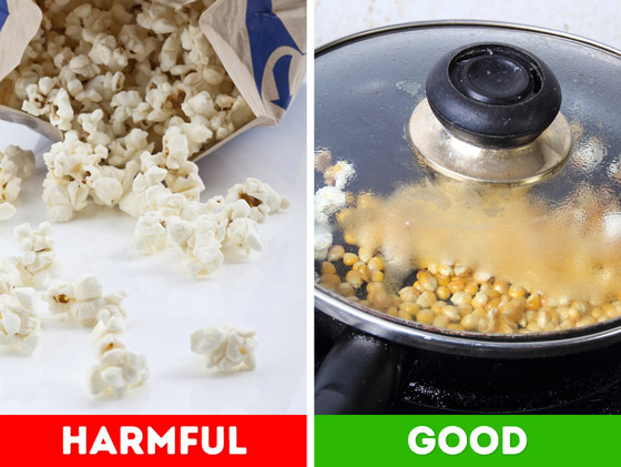 يعد ميكروويف الفشار خيارًا شهيرًا وسريعًا آخر لتناول الوجبات الخفيفة للأطفال، ومع ذلك قد يدرك عدد قليل أن الأكياس المستخدمة في الفشار بالموجات الدقيقة يمكنها إطلاق مواد كيميائية خطرة، لاحتوائها على مواد كيميائية مفلورة، تُستخدم أيضًا في ورق التغليف للوجبات السريعة، وعندما يتم تسخينها على درجة عالية، فإنها تنبعث منها مركبات في العملية التي يمكن أن تكون ضارة بنمو الأطفال وحتى ترتبط بالسرطان. اصنع الفشار بسهولة عن طريق تسخينه في مقلاة مع قليل من زيت الزيتون على الموقد.