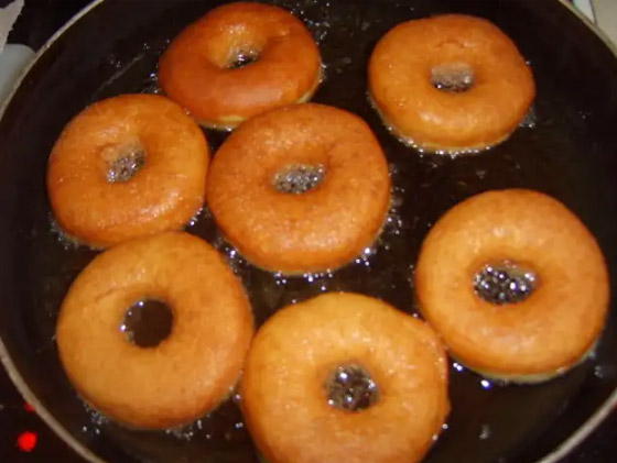 بعد تمام التخمير نفرد العجينة جيدا حتى تكون رفيعة تمام ونقطع العجين بالقطاعة الخاصة بشكل الدونات وبعد ذلك ترص في صينية وتترك لمدة نصف ساعة أو ساعة كاملة حتى ترتاح العجينة تماما، وفي زيت غزير وتكون درجة حرارته متوسطة يقلي الدونات حتى ينتفخ وينضج تماما، بعد ان يبرد يتم تزيينه بأي طريقة حسب الرغبة.