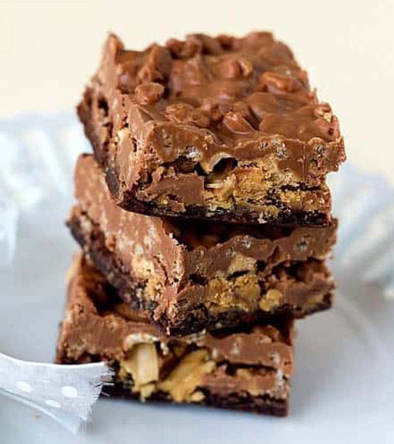 9. قم بإذابة كوب من الشوكولاتة المقطَّعة مع ملعقة زبدة بالميكروويف أو على نار هادئة، ثم أضف إلى المزيج بسكويتاً مقطعاً أو قطع شوكولاتة أو رقائق الذرة (حسب الرغبة)، حرِّك المزيج جيداً ثم قم بمده فوق البراوني البارد، لتتشكل لديك بذلك ثلاث طبقات.