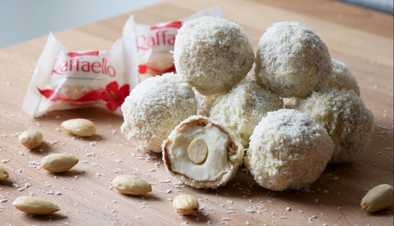 3. في وعاء منفصل ضع القليل من جوز الهند وقم بغمس الكرات التي صنعتها، لتصبح حلوى الرافاييلو جاهزة.
