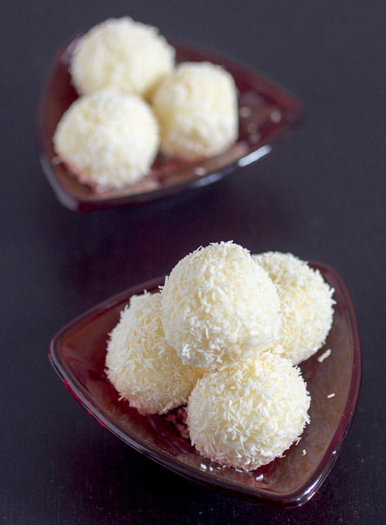 6. نخرج الصينية من الفرن ونتركها لتبرد، لتصبح بعدها كرات جوز الهند جاهزة للتقديم.