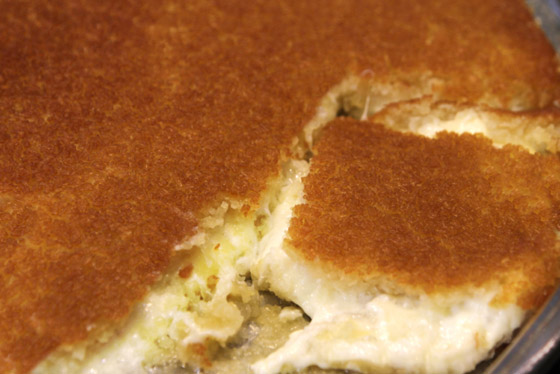 نضع ثلثي عجينة الكنافة في صينيّة نظيفة، ونفردها في الوسط والحواف جيّداً. نسكب مهلبيّة القشطة تدريجيّاً في الوسط، ثم نوزّعها بالتساوي على سطح العجينة كاملة.