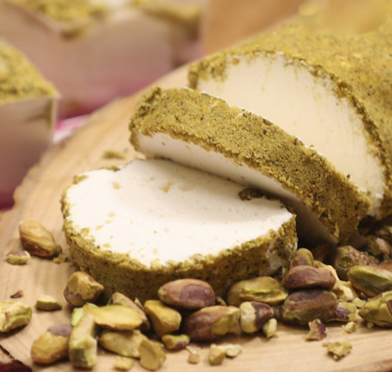 4. نضع الخليط بعد ذلك في خفاق كهربائي، ونخلطه بشكل جيد ونضيف فوقه الفستق، ثم نمده في صينية مناسبة للبراد.