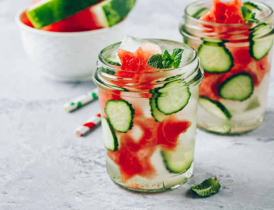 البطيخ الأحمر والخيار من أنواع الفواكه والخيار التي تحوي نسبة جيدة من المياه فيها، لذلك فهي منعشة جداً، خاصة إذا تم إضافة القليل من صودا الليمون معها.