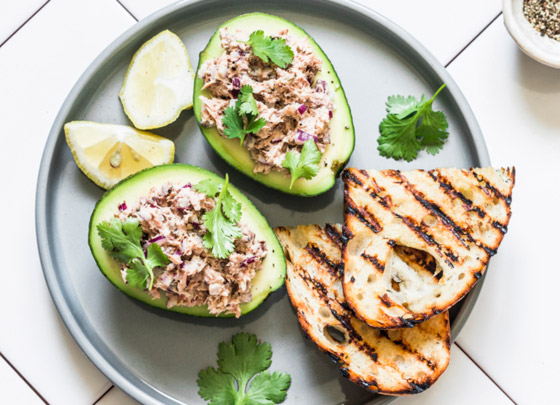 1. الأفوكادو مع التونة البيضاء: سوف تحتاج إلى: تونة بيضاء معلَّبة بعد تصفيتها من الزيت، وشرائح من البصل الأخضر والمايونيز، وفليفلة خضراء مقطَّعة، وملح، وخل، وثوم، وأفوكادو. اخلط التونة والمايونيز والبصل الأخضر والفليفلة المقطَّعة في وعاء، وتبِّل المزيج بالملح والثوم المهروس وقليل من الخل. قطِّع الأفوكادو إلى نصفين، ثم احشُ الخليط بداخل كل نصف على حدة.