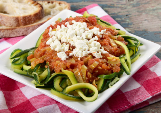2. معكرونة الكوسا: سوف تحتاج إلى: حبَّتي طماطم طازجتين، وصلصة طماطم، وثوم، وخل، وزيت زيتون، وملح، وكوسة. امزج الطماطم المقطَّعة والصلصة مع قليل من الماء والثوم والخل وزيت الزيتون والملح، بوساطة خلاط كهربائي، وإذا كان الخليط سميكاً فأضِف مزيداً من الماء. قطِّع الكوسة إلى شرائح رقيقة وطويلة بحيث تصبح شبيهة بالمعكرونة، ثم أضف الصلصة فوقها.