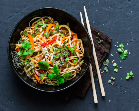 4. باد تاي: ستحتاج إلى كوسة، وجزر، وملفوف، وفلفل حلو، وفاصوليا طازجة، وقليل من المكسرات، وزبدة لوز، وبرتقال، وملعقتي عسل، وملعقة زنجبيل، وصلصة الصويا، وثوم، وبهارات حسب الرغبة. قطّع الكوسة إلى شرائح طويلة باستخدام مقشرة الخضراوات، وكذلك قطِّع الجزر والملفوف ثم اخلطهم مع الفاصوليا الخضراء والفلفل. اخفق زبدة اللوز وعصير البرتقال والعسل والزنجبيل والثوم والفلفل الحار في وعاء. اسكب الصلصة في خليط الخضراوات وقلِّبها جيداً.