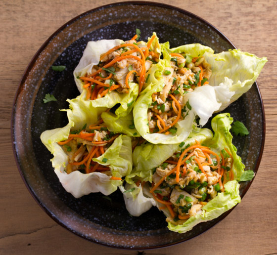 5. صندويش الخس: ستحتاج إلى: دجاج مشوي، وجزر، وكستناء، وزبادي يوناني، وفلفل أحمر، وخس، وصلصة الطماطم. اخلط الدجاج والجزر المقطَّع وكستناء في وعاء كبير. قلِّب الصلصة والزبادي معاً في وعاء منفصل حتى تصبح ناعمة؛ ثم اسكب المزيج فوق خليط الدجاج وقلِّبه. اسكب مزيج الدجاج في أوراق الخس ورش قليلاً من الفلفل.