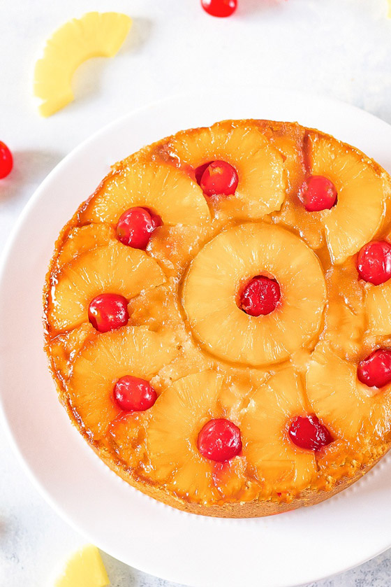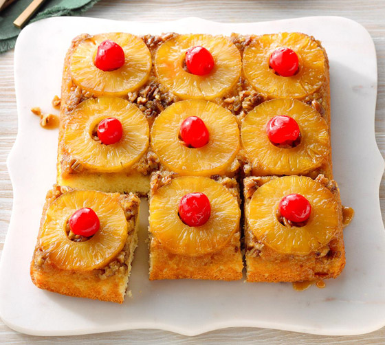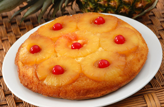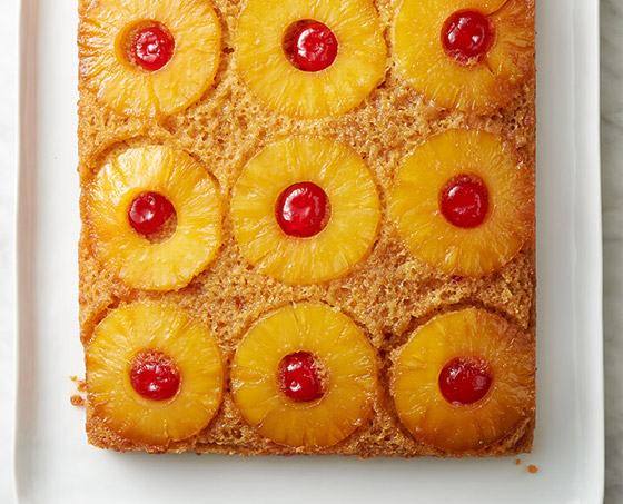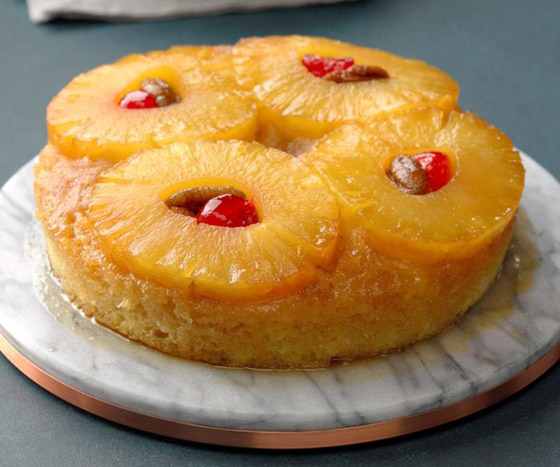 8. عندما تنضج الكيكة، يجب قلبها فوراً على صحن التقديم؛ كي لا تلتصق شرائح الأناناس بالوعاء، بحيث تصبح هي وجه الكيكة.