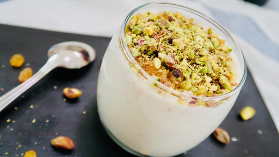 - ثم صبّ في الكوب ورِشّ الوجه بالزبيب والمكسرات، وصحتين وعافية.
