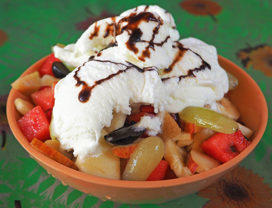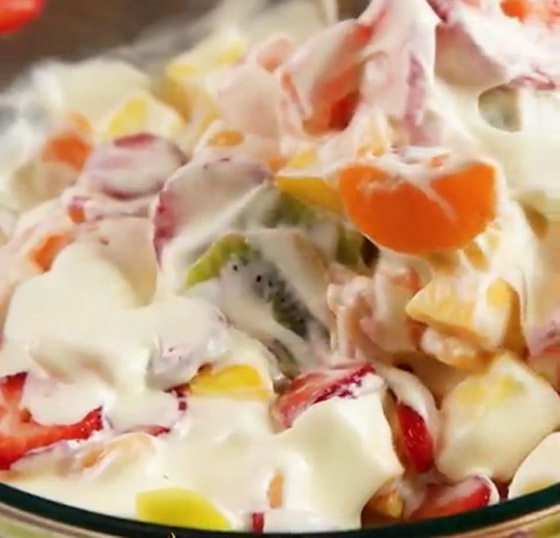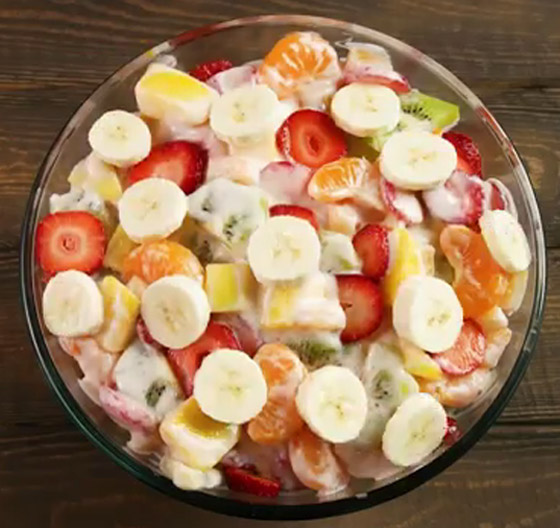 3. الخطوة الثالثة: نقوم بتقطيع كل الفاكهة (باستثناء الموز) إلى قطع صغيرة ونخلطها ببعضها ونضيفها فوق الجبن.