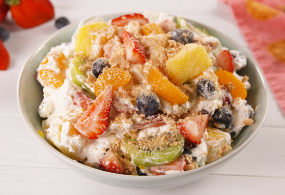 4. الخطوة الرابعة: تُمزج الفاكهة مع مزيج الجبن الكريمي برفق.