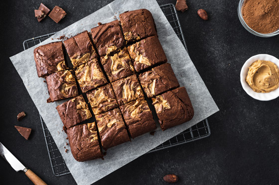 5. وزع زبدة الفول السوداني بالتساوي فوق الحلوى المبردة.
