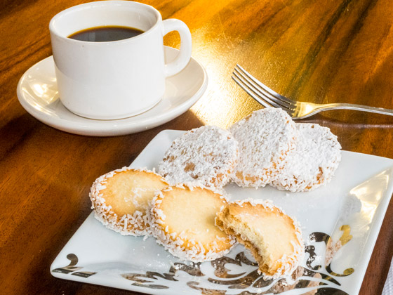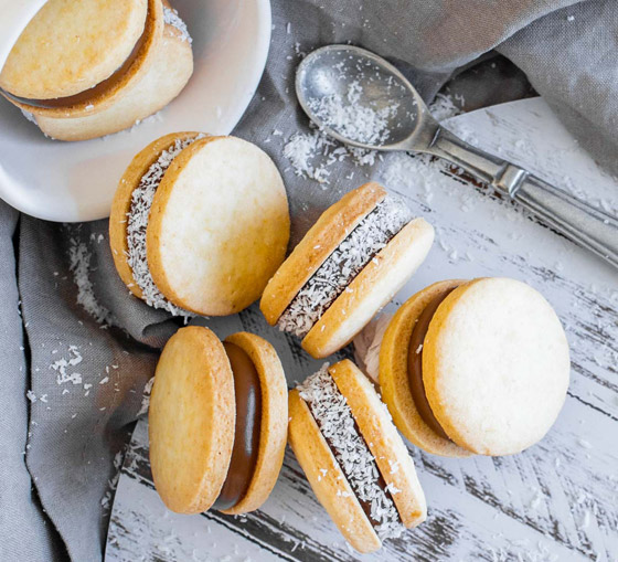 7. الخطوة السابعة: نترك البسكويت يبرد، ومن ثم نقوم بوضع طبقة من كريمة الدولسي دي ليتشي فوق القطعة الأولى ونغطيها بقطعة بسكويت ثانية ونرشها من الجوانب بجوز الهند، حتى تصبح جاهزة للأكل.