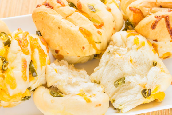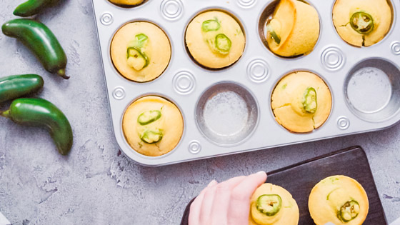 2. قطِّع 12 شريحة عرضية رقيقة من الهالبينو لتضعها على الجزء العلوي من المافن، وقطع الباقي إلى قطع صغيرة.