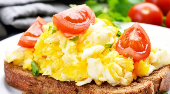 * طريقة التحضير: اخفق الكريمة والبيض والملح والفلفل بشكل جيد حتى تظهر الرغوة، ضع الزبدة في المقلاة وانتظر قليلاً حتى تذوب، ثم أضف مخفوق البيض إليه، استمر في تحريك البيض حتى ينضج، ثم ضعه فوق قطعة التوست وزينه بالبقدونس وقدمه إلى جانب البندورة المقطعة.