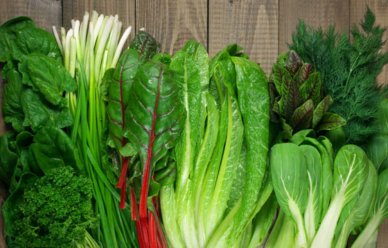 4. الخضراوات الورقية: تحتوي الخضراوات الورقية الداكنة على كميات جيدة من فيتامين ِA وC وK والمغنيسيوم والكالسيوم. كما أنها غنية بالحديد والألياف الغذائية ولها مؤشر منخفض فيما يتعلق بنسبة السكر في الدم، علاوة على أنها غنية جدًا بالمواد الكيميائية النباتية وفلافونيدات ب-كاروتين. تظهر العديد من الدراسات أن الخضر الورقية توفر حماية من أمراض القلب والأوعية الدموية والسرطان. وتساعد مضادات الأكسدة بها في تقليل الضرر التأكسدي للخلايا، وبالتالي تساعد في مكافحة الشيخوخة. ويعزز فيتامين A صحة العين.