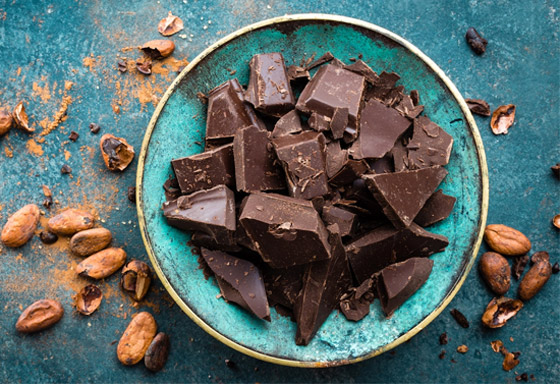2. الشوكولاتة الداكنة: رغم أن الإفراط في تناولها يسبب السمنة، فإن تناولها باعتدال مهم للغاية للحفاظ على صحة نفسية جيدة، إذ تعتبر الشوكولاتة الداكنة من الأطعمة التي تجلب السعادة وتعزز الحالة المزاجية. تحتوي الشوكولاتة على العديد من المركبات التي تجعلها جالبة للسعادة، مثل الكافيين والثيوبرومين ومادة كيميائية تدعى N-acylethanolamine، بالإضافة إلى مركبات الفلافونويد، التي ثبت أنها تزيد من تدفق الدم إلى الدماغ وتقلل الالتهاب، وتعزز صحة الدماغ، ما يساعد كذلك في تحسين الحالة المزاجية. ونظراً لأن شوكولاتة الحليب تحتوي على مكونات مضافة مثل السكر والدهون، فمن الأفضل اختيار الشوكولاتة الداكنة، التي تحتوي على نسبة أعلى من الفلافونويد وأقل في السكر المضاف. كذلك لا يجب تناول ما يزيد عن مربع صغير أو اثنين يومياً، لأن الشوكولاتة تحتوي على سعرات حرارية عالية.